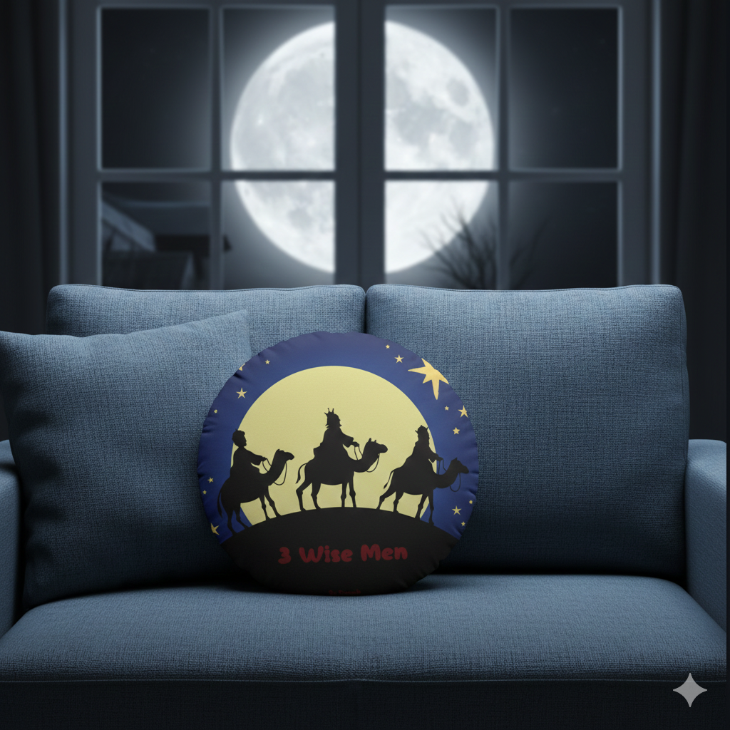This circular pillow depicting the 3 Wise Men traveling through the night to meet the new born king elevate adds a spirital touch to any space. The outer cover is made with smooth, plush polyester while the filling is lush polypropylene cotton.\.